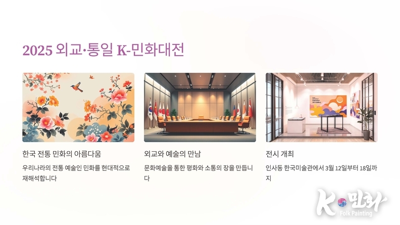 이번 전시에서는 외교와 통일을 주제로 한 k-민화 작품, 현대적 해석을 가미한 다양한 장르의 작품들이 소개된다. 또한, 전시 기간 동안 작가와의 대화와 특별 강연 등 다양한 부대 행사도 함께 진행될 예정이다.