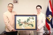K-민화 관리자 기자 | 명지대학교 K-민화학과 이미형 주임교수가 타니 쌩랏 태국대사에게 민화작품을 기증했다. 이교수는 주한 외국 대사관에 16번째 한국의 K-민화를 기증 했다.
