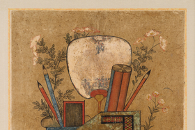 K-민화 이성준 기자 | 책을 중심으로 관련된 물건을 함께 늘어놓은 그림. 지본채색. 액자(세로 80.5, 가로 53.5)에 끼워짐. 책갑으로 묶인 책을 중심으로 하단에는 수박 등의 길상 상징물, 상단에는 초화·부채·붓 등이 표현됨. 좌우 대칭을 이루는 구도로 등축도법이 응용됨. 화분은 '壽'자가 적히고 점묘법으로 표현됨. 붉은색과 푸른색이 주로 사용됨. 수박 등은 녹색으로 표현됨. 소장품 명칭 : 문방도(文房圖) 국적/시대 : 한국-조선 용도/기능 : 문화예술-서화-회화-민화 크기 : 세로 : 53 / 가로 : 33.5 소장품 번호 : 민속024206
