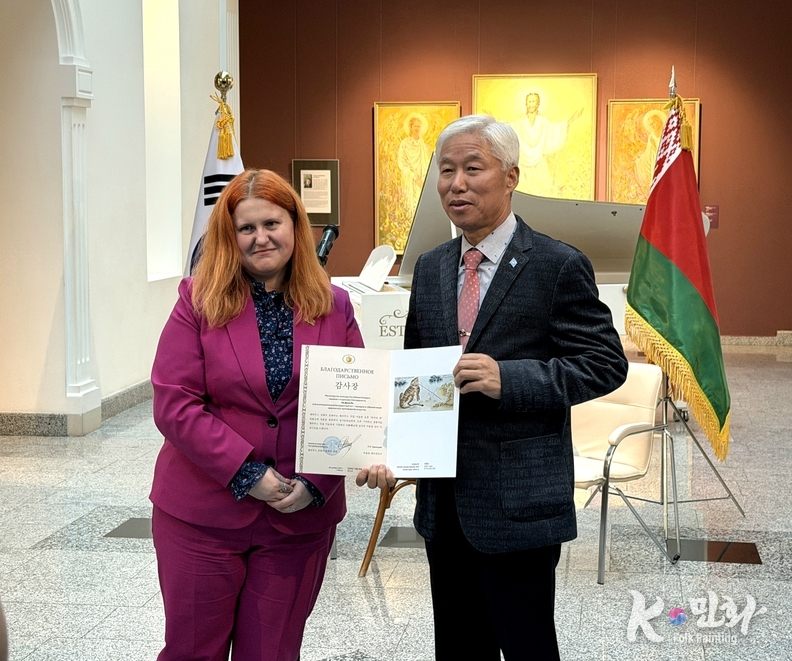 “K-민화는 세계와 소통하는 한국의 마음입니다” 나는 개막식에서 이렇게 말했다. “전통은 과거의 유물이 아니라, 현재를 비추는 거울이며 미래를 여는 빛입니다.” K-민화는 과거의 그림이 아니다. 그림 속에 살아 있는 한국인의 마음이다. 그 마음이 벨라루스 국민들의 마음에 닿았고, 그 만남에서 우정과 존중의 씨앗이 싹텄다. 한국의 민화가 외국의 박물관에 기증된다는 것은 단순한 미술품 이전이 아니다. 그 안에 담긴 정신·철학·미의식이 함께 전달되는 것이다.