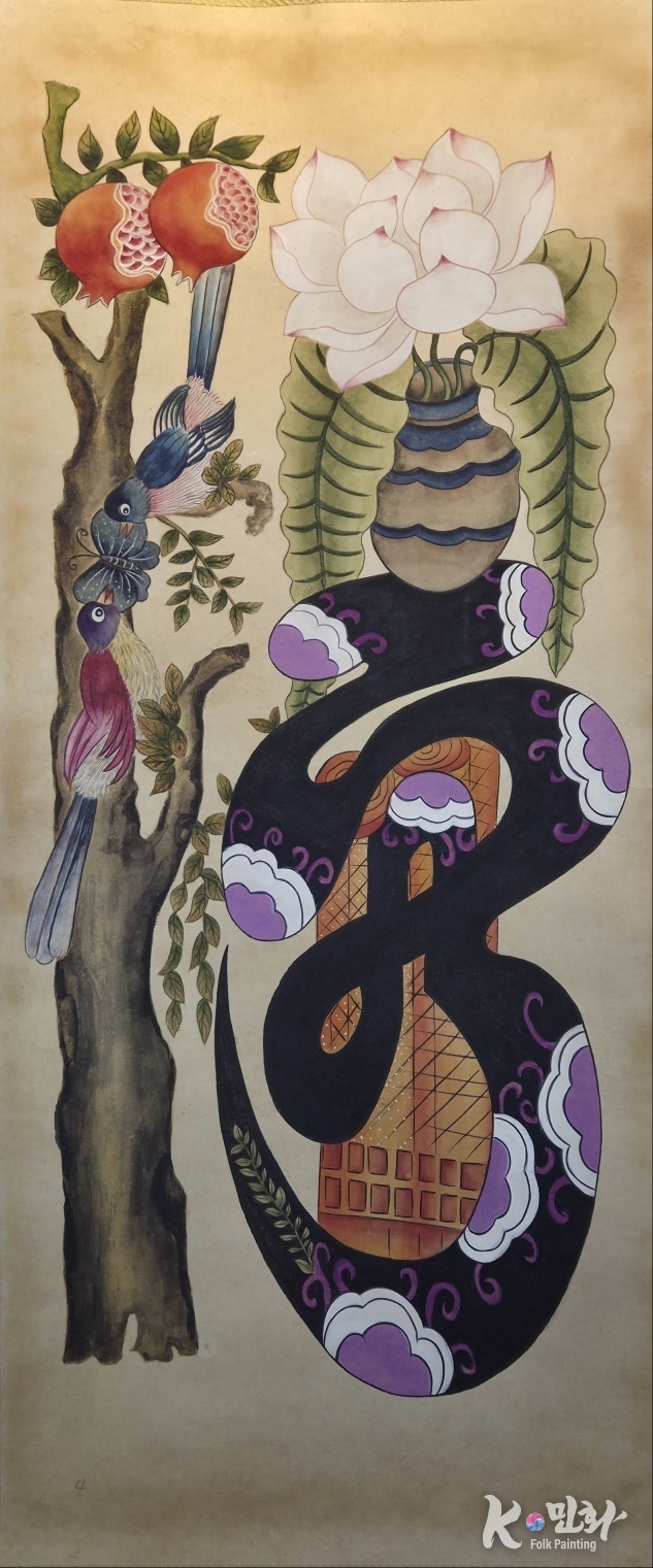 K-민화 이성준 기자 | 본 작품은 유교적 덕목인 효孝와 제悌를 새해의 길상적 의미와 결합한 문자도 형식의 세화이다. 효 자에는 석류, 연꽃, 새와 덩굴이 어우러져 생명의 잉태와 번성, 부모에 대한 공경과 은혜의 깊이를 상징한다. 석류의 다산과 연꽃의 청정함은 부모의 희생과 품성을 드러내며, 서로 기대어 있는 새들은 부모와 자식 간의 정을 은유한다.