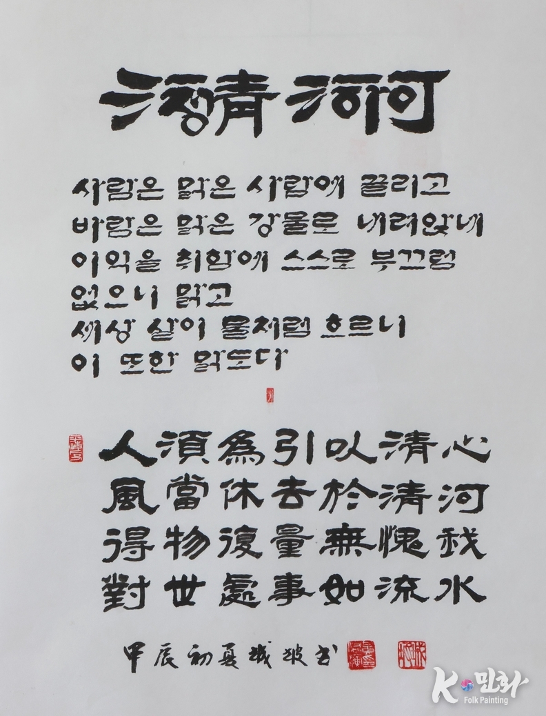 K-민화 강경희 기자 | 이 k-그라피 작품의 첫 문장은 선언에 가깝다. 「청하淸河를 읽다. 」, 맑음은 가능하다는 말이다. 그러나 성파 작가는 여기서 멈추지 않는다. 이 가능성은 조건이 아니라 태도이며, 세상과 관계 맺는 하나의 방식임을 글과 획으로 증명해 보인다.