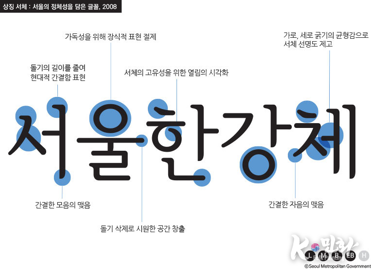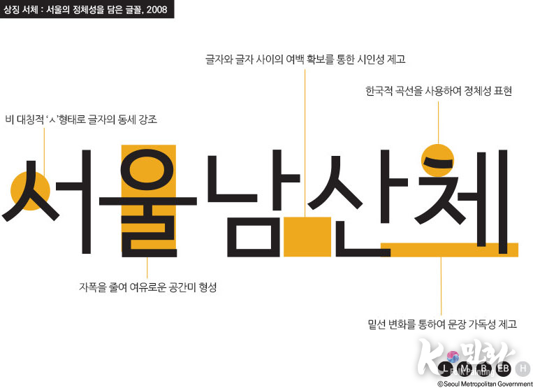 2008년 7월 오세훈 시장의 디자인 도시 선언과 함께 탄생한 서울서체는 강직한 선비정신과 단아한 여백의 미를 담고 있다. 조형적으로는 한옥의 열림과 기와의 곡선미를 표현했으며, '한강'과 '남산'이라는 서울의 대표 자산에서 이름을 따왔다.