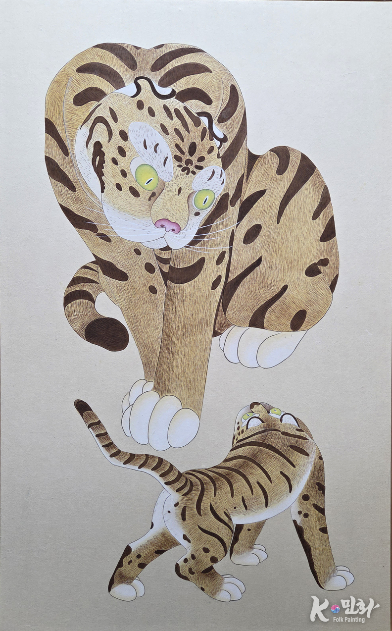 큰 호랑이가 아기 호랑이를 내려다보는 시선에는 훈육과 보호, 사랑이 공존하는 한국적 모성·부성의 정서가 깃들어 있다. 아기 호랑이는 천진한 눈빛으로 어른 호랑이를 올려다보며, 세상에 대한 호기심과 생동감을 드러낸다.