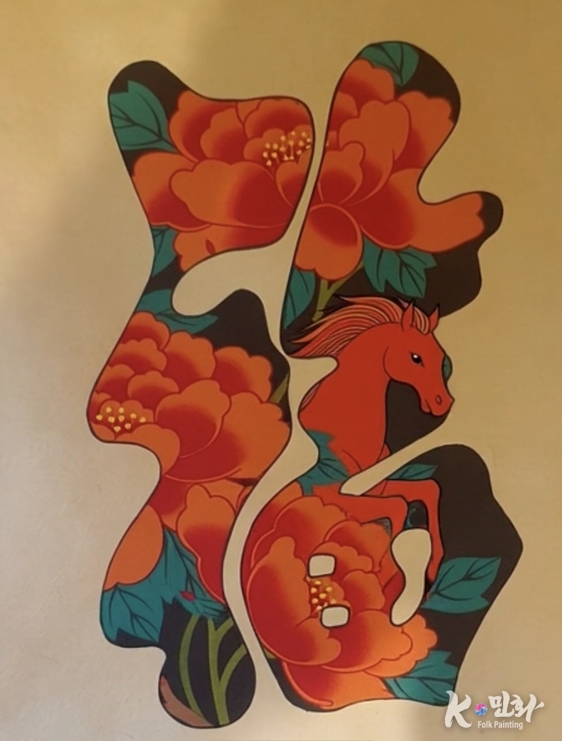 처음 작품을 마주하면 가장 먼저 눈에 들어오는 것은 붉은 모란꽃이 가득 메운 福복字의 형상이다. 모란은 부귀와 영화, 복과 번성의 상징으로 오래 사랑받아온 민화의 대표 길상吉祥이다. 그 화려한 꽃잎 사이로 고개를 내민 붉은 말은 단순한 장식적 요소가 아니라, 2026년 한 해의 운세와 기운을 상징하는 핵심 모티프다.