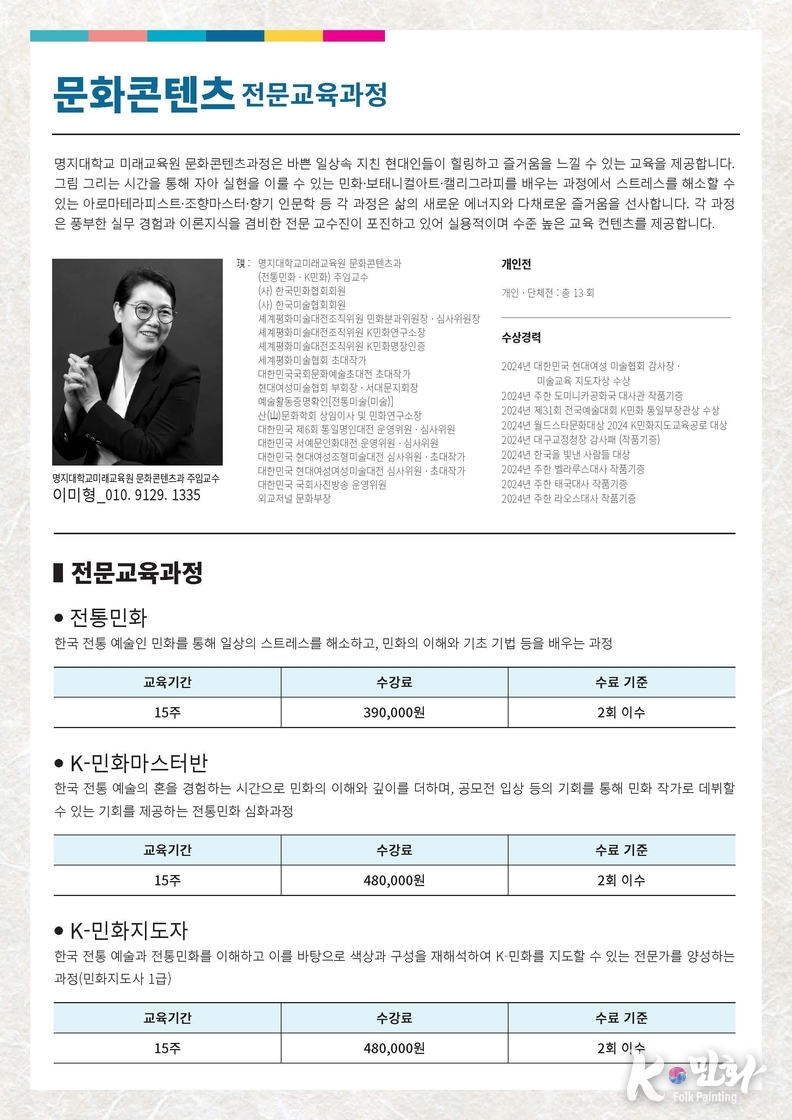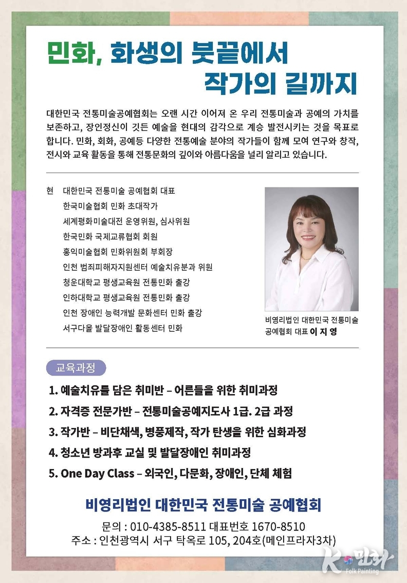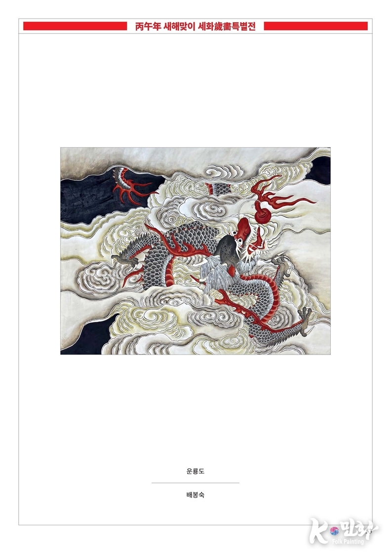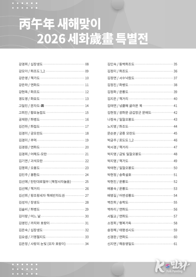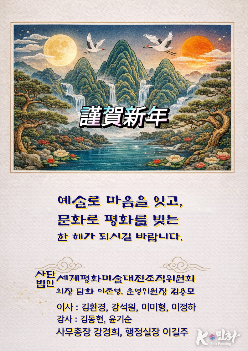 K-민화 강경희 기자 | K-민화와 민화한복이 만나는 ‘세화 특별전’이 오는 2026년 1월 1일부터 5일까지 서울 인사동 한국미술관에서 열린다. 이번 전시는 새해의 안녕과 복을 기원하던 전통 세화歲畵를 현대적으로 재해석해, K-민화 전시와 민화한복 패션, 문화 퍼포먼스를 아우르는 융복합 특별전으로 기획됐다.