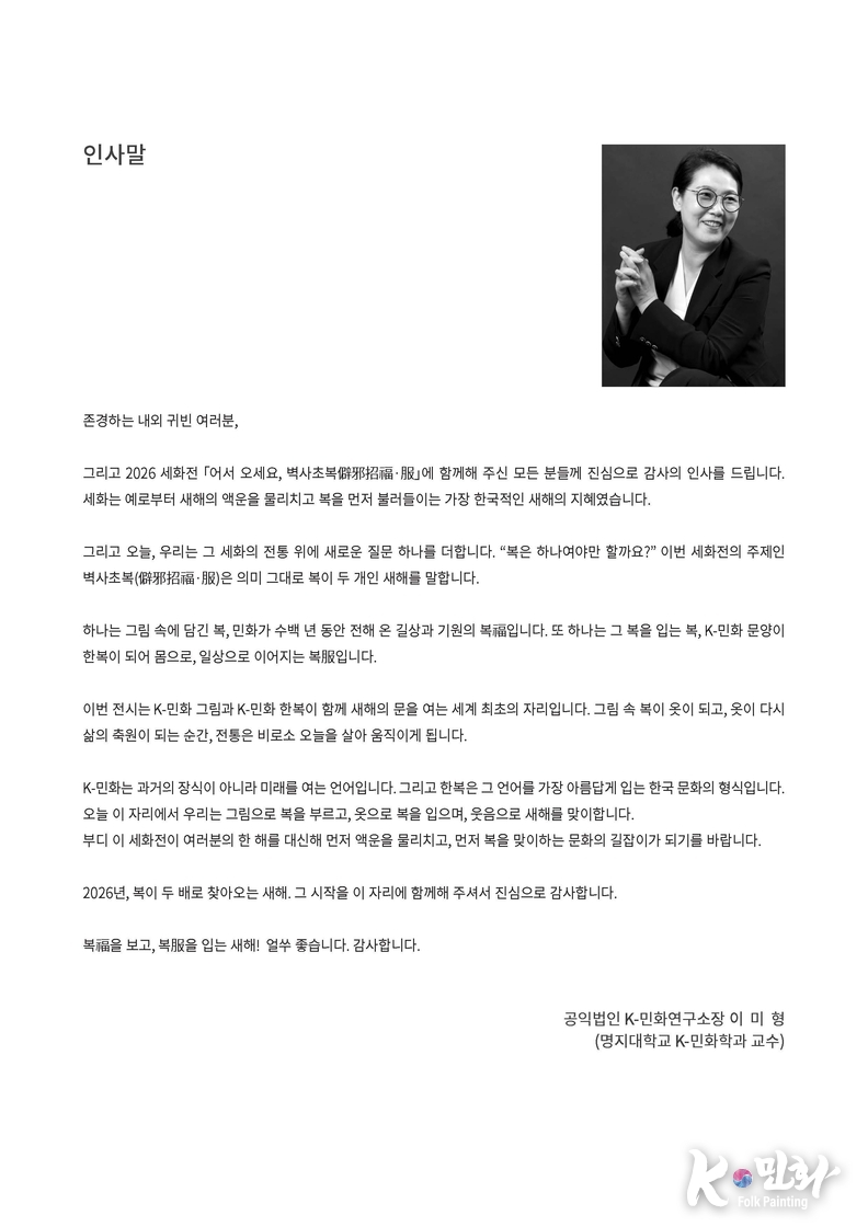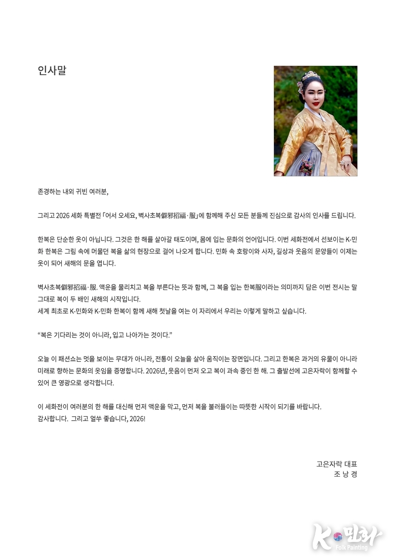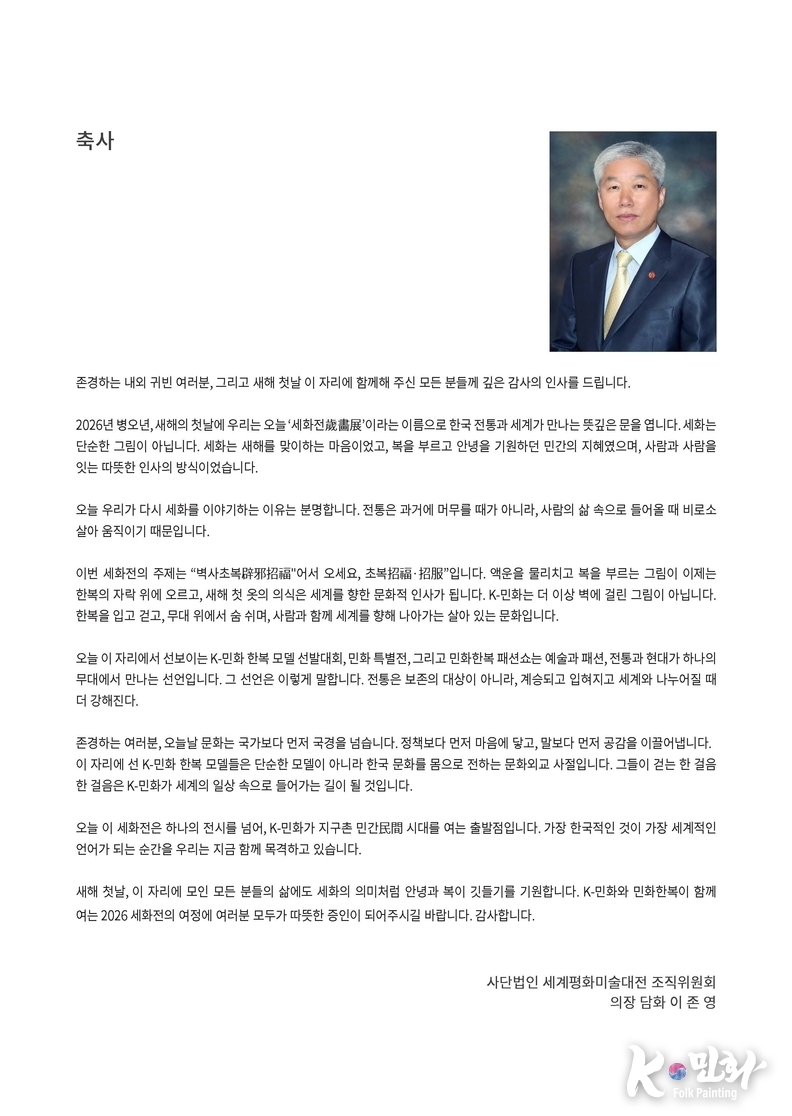 전통은 늘 질문을 받는다. “지금 이 시대에도 유효한가.” 그러나 더 정확한 질문은 이것이다. 전통은 어떻게 살아 움직이는가. 2026년 병오년 새해 첫날, 서울에서 개막하는 세화전歲畵展은 이 질문에 하나의 분명한 답을 내놓는다. 전통은 박물관에 보관될 때보다, 사람의 몸 위에서 살아 움직일 때 비로소 현재가 된다. K-민화와 민화한복이 만난 이번 세화전은, 한국 전통이 ‘보는 문화’를 넘어 ‘입는 문화’, ‘걷는 문화’, ‘세계로 향하는 문화’로 전환되는 상징적 장면이다.