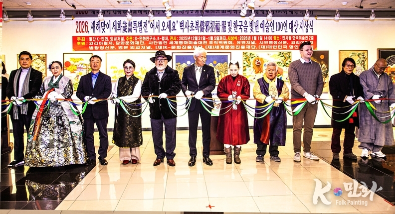 K-민화 이성준 기자 | 2026년 병오년 새해 첫날인 1월 1일, 서울 인사동 한국미술관 2층에서는 세화 특별전 「어서 오세요, 벽사초복僻邪招福·服」이 200여 명의 내외 귀빈과 관람객이 참석한 가운데 성황리에 개최됐다.