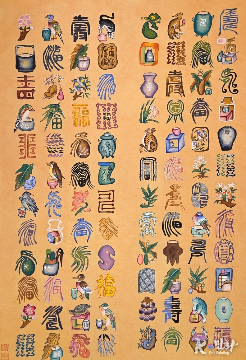 K-민화 이성준 기자 | k-민화에서 ‘백수백복百壽百福’은 단순한 기원이 아니다. 그것은 오래 살고 많이 누리겠다는 소망을 넘어, 삶의 모든 국면에 깃들기를 바라는 총체적 축원이다. 장금희 작가의 ‘백수백복도’는 이 오래된 말에 현대의 눈금자를 대지 않는다. 대신, 복을 하나하나 세고, 삶을 하나하나 헤아리는 방식으로 전통의 깊이를 되살린다.