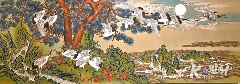 소나무는 굽이치며 서 있다. 바람과 세월을 견뎌온 몸의 기록이다. 그 곁을 흐르는 물과 바다는 쉼 없이 반복되는 삶의 리듬을 암시한다. 그리고 그 위로 흰 학들이 날아오른다. 이 비행은 도약이 아니라 순환이다. 떠남과 귀환, 시작과 마무리가 하나의 호흡으로 이어진다.