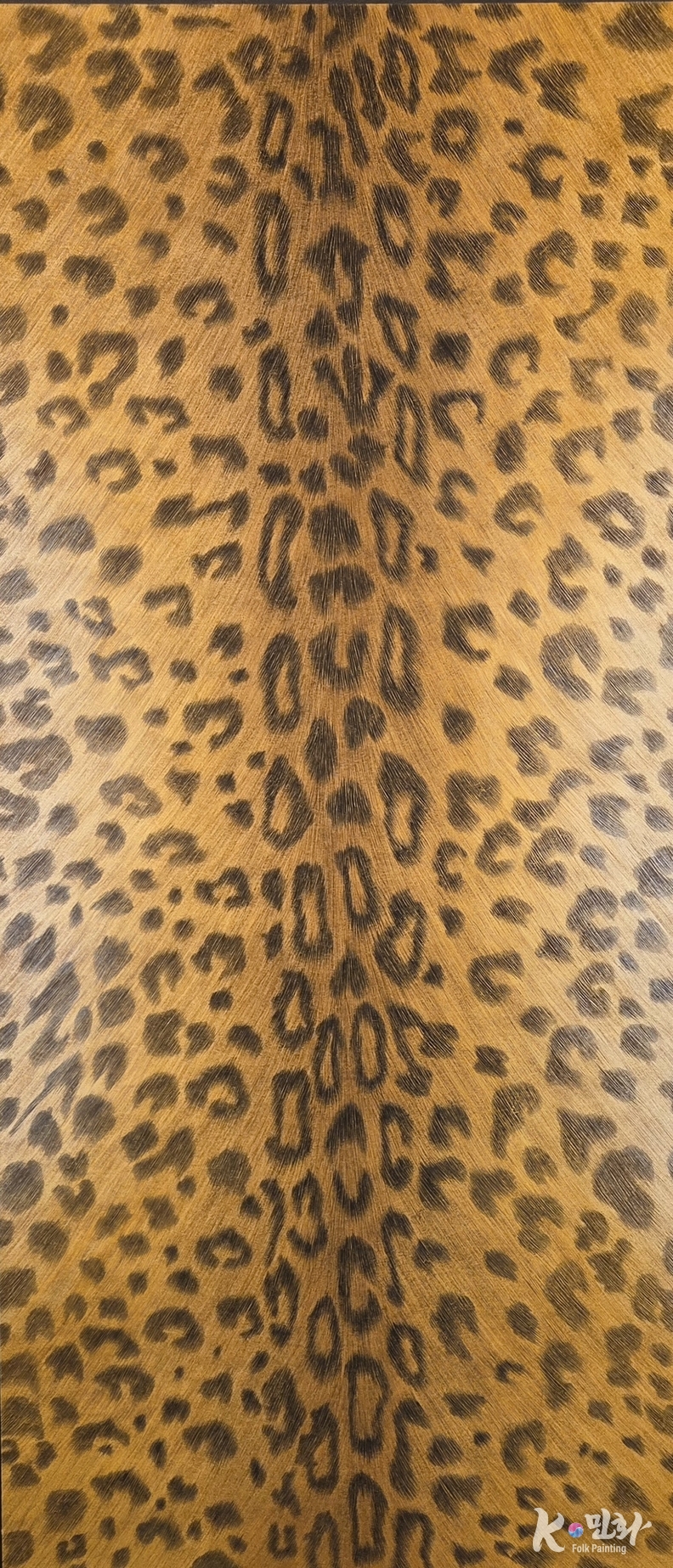 색감 또한 절묘하다. 황토에 가까운 바탕 위에 얹힌 검갈색의 무늬는 과하지 않으며, 오히려 오래된 시간의 결을 닮았다. 이는 ‘날카로운 포효’가 아니라, 침묵 속의 위엄이다. 민화가 늘 그러했듯, 이 호피도는 보는 이를 압도하지 않는다. 대신 곁에 두고 오래 마주할수록, 점점 깊어지는 기운으로 공간을 장악한다.