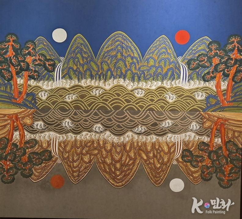 특히 수면水面을 가로지르는 반복의 파동은 인상적이다. 겹겹이 쌓인 물결은 단순한 장식이 아니라 시간의 층위처럼 읽힌다. 흐르되 무너지지 않고, 반복되되 지루하지 않다. 이는 민화가 가진 가장 큰 미덕과 질서를 통한 안정을 현대적으로 번역한 결과다. 자연은 요동치지만, 그 요동 안에는 언제나 법칙이 있다.