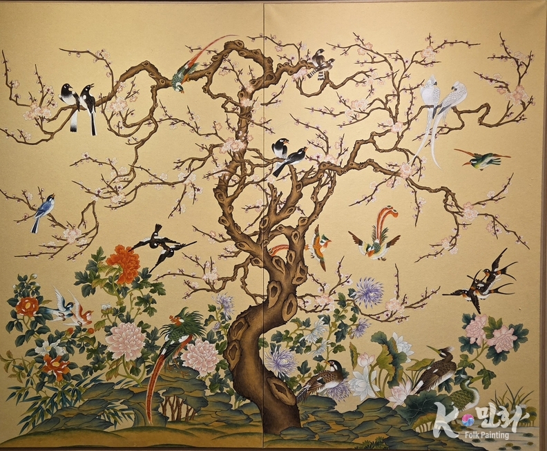 K-민화 이성준 기자 | 이 그림 앞에서는 누구도 서두르지 않게 된다. 노지영 작가의 '화조도'는 한 계절의 풍경을 보여주는 데서 멈추지 않고, 생명이 머무는 방식을 조용히 들려준다. 화면을 가득 채운 매화 가지와 꽃, 그리고 저마다의 자리를 지키는 새들은 ‘움직임’보다 ‘공존’을 먼저 말한다.
