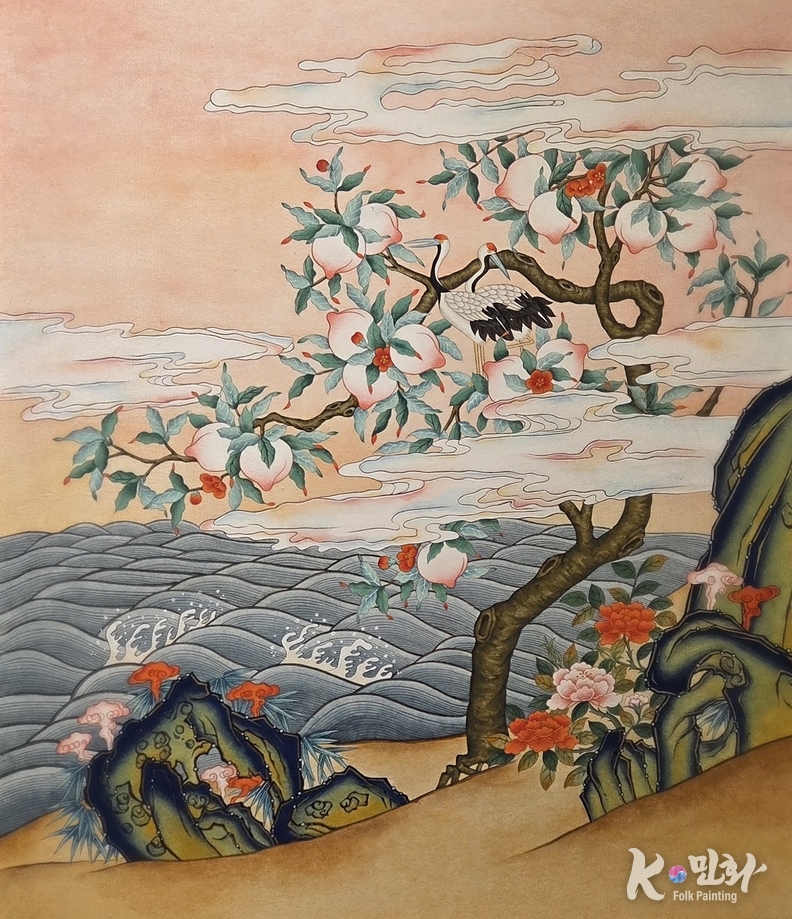 복숭아나무는 바람을 타고 굽이치며, 학은 가지 위에 앉아 서로의 균형을 살핀다. 바다는 규칙적인 파문을 만들고, 구름은 그 위를 가볍게 건너간다. 여기에는 힘의 과시가 없다. 장수는 위에서 내려오는 축복이 아니라, 관계의 리듬에서 생겨난다는 민화의 지혜가 고스란히 드러난다.