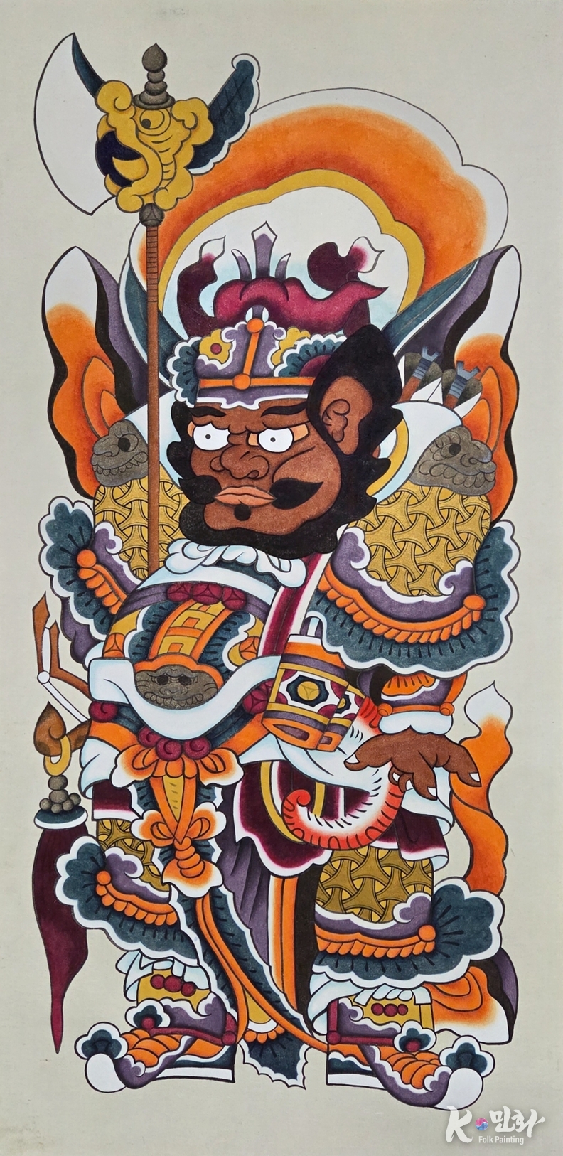 광화문을 상징하는 공적 공간의 문 앞에 금갑장군을 세움으로써, 개인을 넘어 공동체와 질서를 지키는 수호의 의미를 담고자 했다. 위협보다 품격, 공포보다 중심을 지키는 장수의 형상을 통해 오늘의 민화가 나아갈 방향을 제시한다.