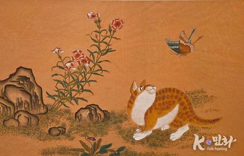 K-민화 이존영 기자 | k-민화 속 고양이는 늘 흥미로운 존재다. 쥐를 잡지 않거나, 호랑이 옆에서 태연히 눕고, 때로는 세상의 이치를 가장 먼저 알아차린 얼굴로 화면 한켠을 차지한다. 고희진 작가의 '황묘농접도' 속 고양이는 그중에서도 특별하다. 이 고양이는 사냥하지 않는다.