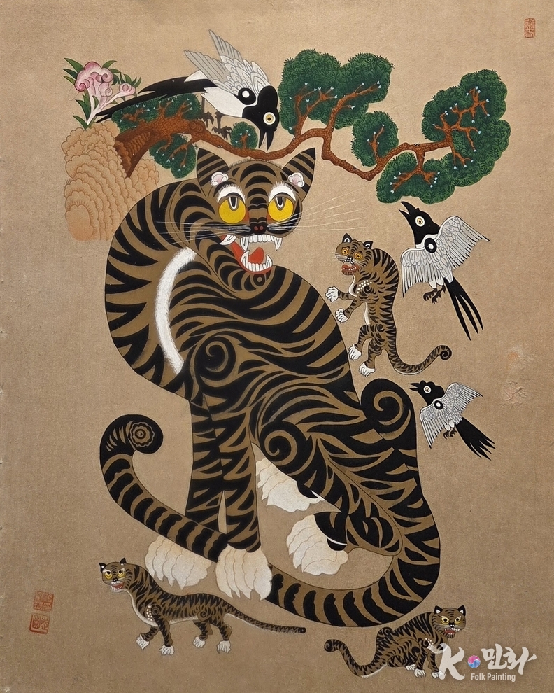 K-민화 이존영 기자 | 민화 속 호랑이는 늘 두 얼굴을 지닌다. 산군山君으로 불리며 두려움의 상징이 되기도 하고, 한편으로는 어딘가 어수룩한 표정으로 웃음을 자아낸다. 김영민 작가의 '까치와 호랑이'는 바로 그 이중성의 미학을 정면에서 드러낸다.
