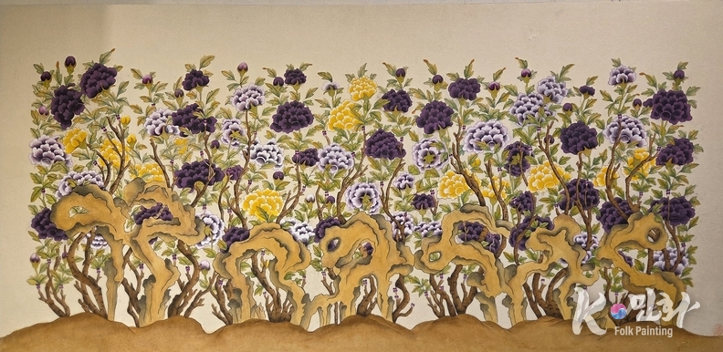 K-민화 이존영 기자 | 모란은 늘 부귀의 상징으로 불려왔다. 그러나 이연희 작가의 '괴석모란'에서 모란은 단순한 풍요의 꽃이 아니다. 이 꽃은 견딘 자리에서 피어난 결과다. 작품 아래를 차지한 괴석들은 매끈하지 않고, 아름답지도 않다. 바람과 비, 시간을 견뎌온 흔적이 그대로 남아 있다. 그 위에 모란이 선다. 화려함은 위에서 오지 않고, 아래의 무게에서 자라난다.