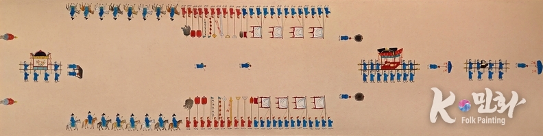 색채와 배열은 반복을 통해 안정감을 만든다. 같은 옷, 같은 기물, 같은 간격의 행렬은 획일이 아니라 신뢰의 리듬이다. 누구도 예외가 되지 않는 구조 속에서만 즉위는 정당성을 얻는다. 그래서 이 반차도는 축제가 아니라, 국가의 약속문처럼 읽힌다.