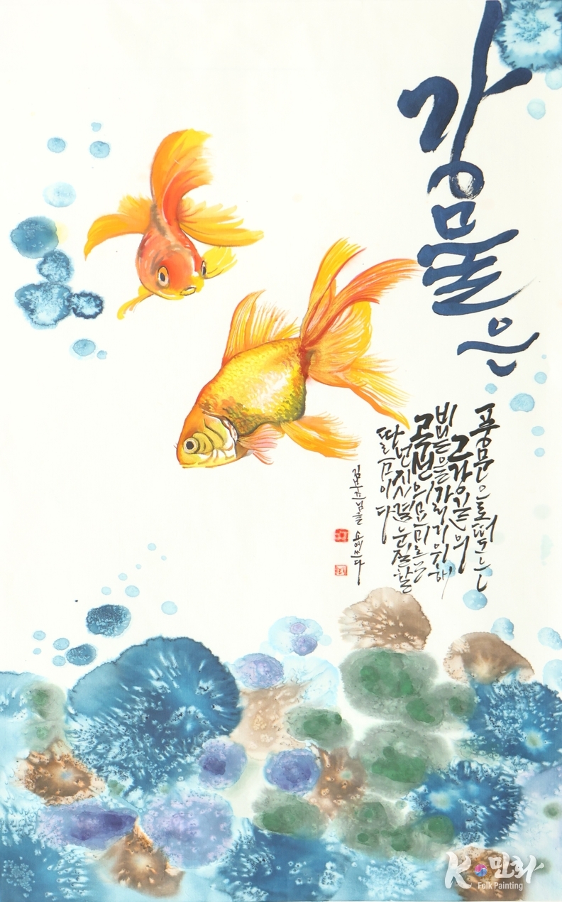 작품을 가로지르는 두 마리의 금붕어는 부유하듯 헤엄치는 이 생명체는 민화의 전통적 길상吉祥을 닮았지만, 그 표현은 과거에 머물지 않는다. 비늘 하나하나에 담긴 색의 농담은 오늘의 감각이고, 유영하는 방향에는 규칙도, 구속도 없다.
