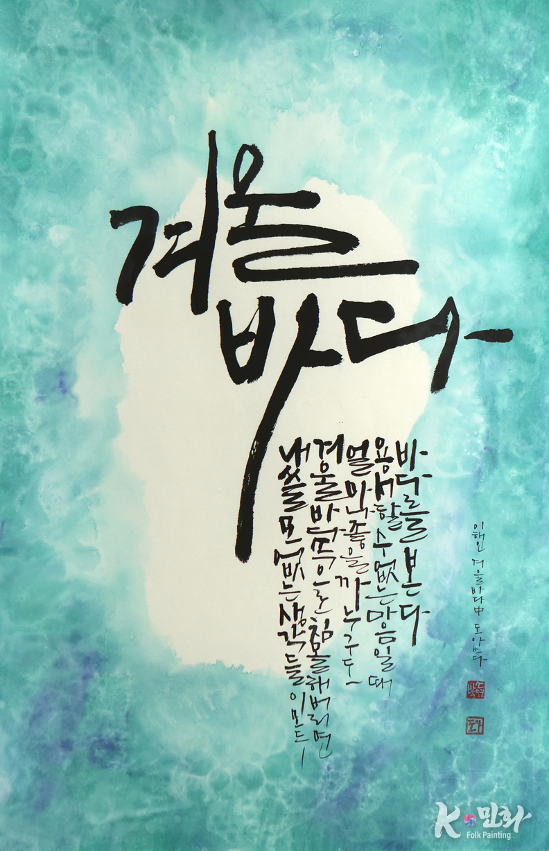 작품 중앙을 가르는 굵은 필획. “겨울바다.” 이 글자는 제목이면서 동시에 버팀목이다. 무너지지 않기 위해, 더 깊이 내려간 한 줄의 중심. 그 아래 이어지는 문장은 시가 아니라 고백에 가깝다.