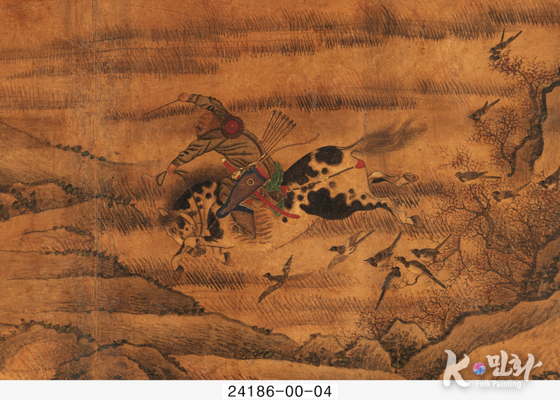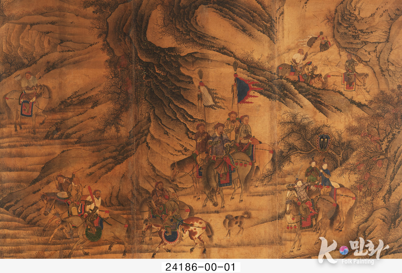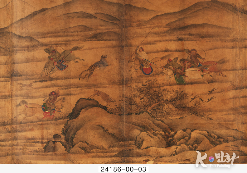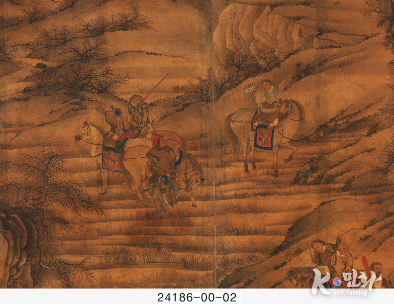 K-민화 이성준 기자 | 호족(胡族)들이 사냥하는 장면을 그린 그림. 지본채색. 연폭의 절첩식(세로 115, 가로 420). 오른쪽에는 바위, 왼쪽에는 낮은 토산(土山)이 있는 평원이 그려짐. 말을 탄 인물들이 활 등으로 사냥하는 모습이 표현됨. 호랑이·사슴·여우·개·원숭이가 그려짐. 산수는 담채로 표현되고, 일부에 녹색 태점이 가해짐. 인물 등은 세필로 윤곽이 그려지고, 음영이 표현됨.