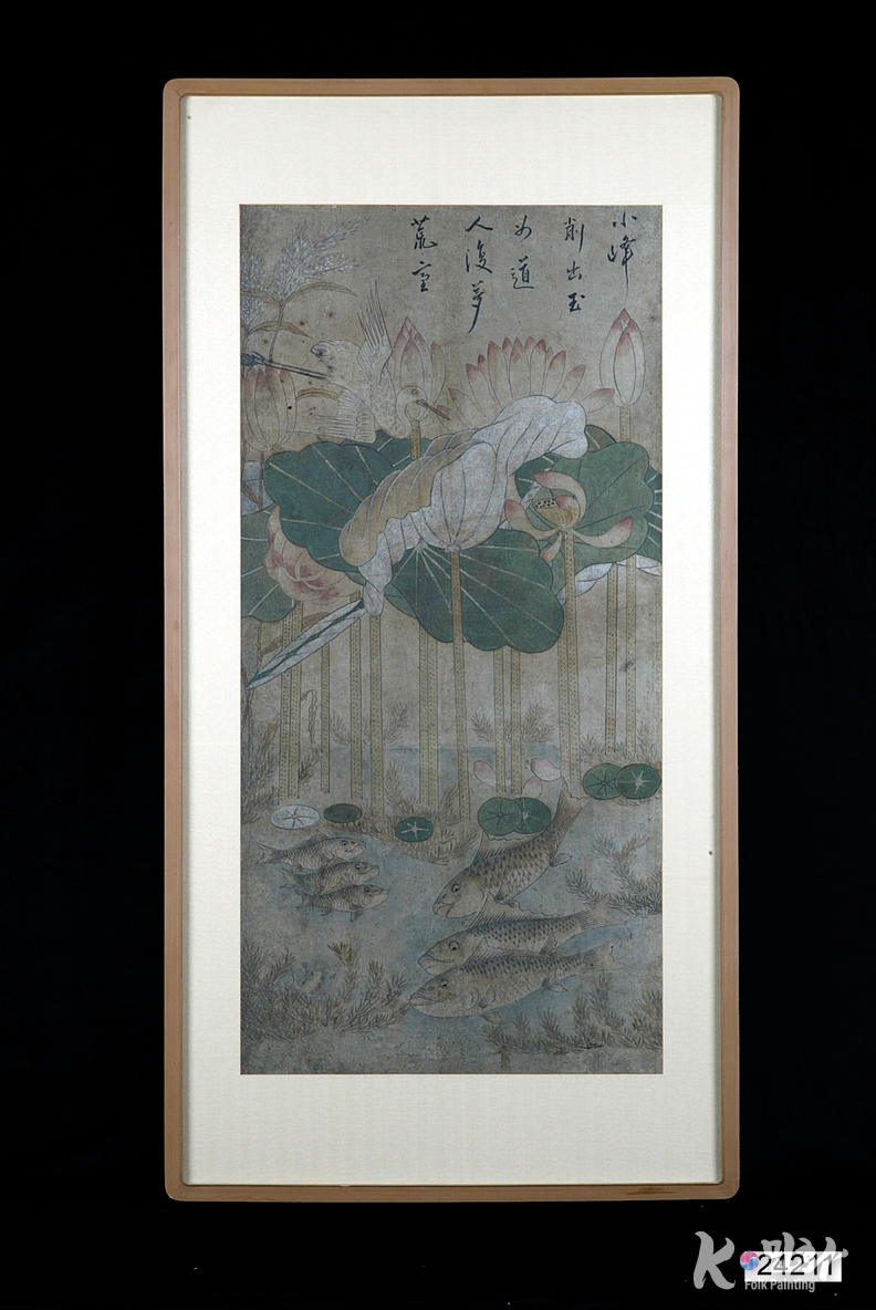 K-민화 이성준 기자 | 여유와 군자를 상징하는 연꽃과 잉어를 주요 소재로 그린 그림. 지본채색. 액자(세로 124, 가로 63.5)에 끼워짐. 화면 중앙에 곧게 뻗은 넓은 연잎과 활짝 핀 연꽃 등이 있고, 하단에 잉어 6마리가 그려져 있음. 연꽃 위에는 학과 갈대가 그려짐. 상단 여백에 먹으로 쓴 글귀가 있음. 주로 연녹색과 분홍색이 사용됨.