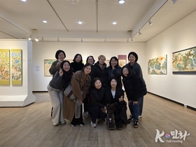 K-민화 이존영 기자 | 민화에서 물고기는 늘 ‘과정’의 상징이었다. 아직 하늘을 날지 못하지만, 이미 하늘을 향해 몸을 틀고 있는 존재이다. 정선영 작가의 '금입은어변성령도'은 그 결정적 순간을 원형의 우주 속에 봉인한다. 검은 바탕 위에 금빛으로 떠오른 원은 경계이자 약속이다. 이 원 안에서 물고기는 단순한 생물이 아니다. 파도를 가르는 몸짓은 수행의 반복을 닮았고, 비늘 하나하나는 시간의 층위를 이룬다. 물결은 쉼 없이 겹치며, 용문을 향한 의지는 흔들림 없이 축적된다. 여기서 ‘변變’은 돌연한 기적이 아니라 견딘 시간의 합이다. 주목할 것은 입에서 피어오르는 구름과 불꽃의 결이다. 아직 완전한 용의 형상은 아니지만, 이미 숨은 바뀌었다. 이는 결과를 앞서 보여주지 않는 민화의 미덕이다. 대신 가능성이 현실을 밀어 올리는 압력을 그린다. 그래서 이 그림의 긴장은 과장되지 않고, 도약은 소란스럽지 않다. 금입金入의 선택 역시 의미심장하다. 금은 부의 표식이 아니라, 인내가 끝내 획득한 광채다. 검은 바탕과의 대비는 ‘빛나기 위해 어둠이 필요하다’는 오래된 진실을 환기한다. 원형 구도는 시작과 끝을 지우며, 도약이 곧 순환임을 말한다. 오르는 자는 다시 흐